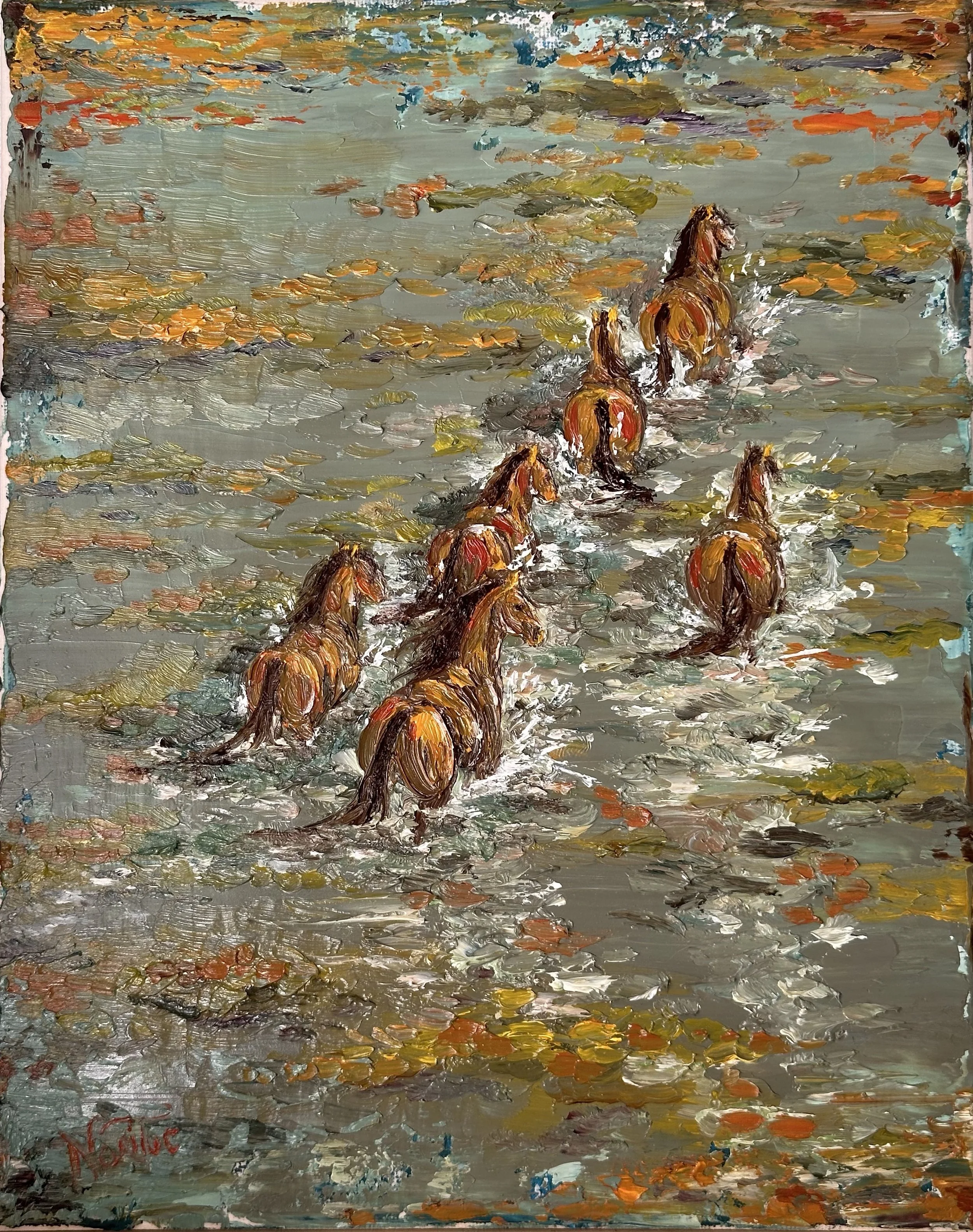 This painting captures a mesmerizing scene where six majestic horses stroll slowly through crystal-clear water, as the setting sun bathes the landscape in warm, enveloping hues. Viewed from an almost elevated perspective, the sweeping panorama accentuates the graceful motion of the horses, their manes undulating like soft whispers in the rhythm of a forgotten steppe.